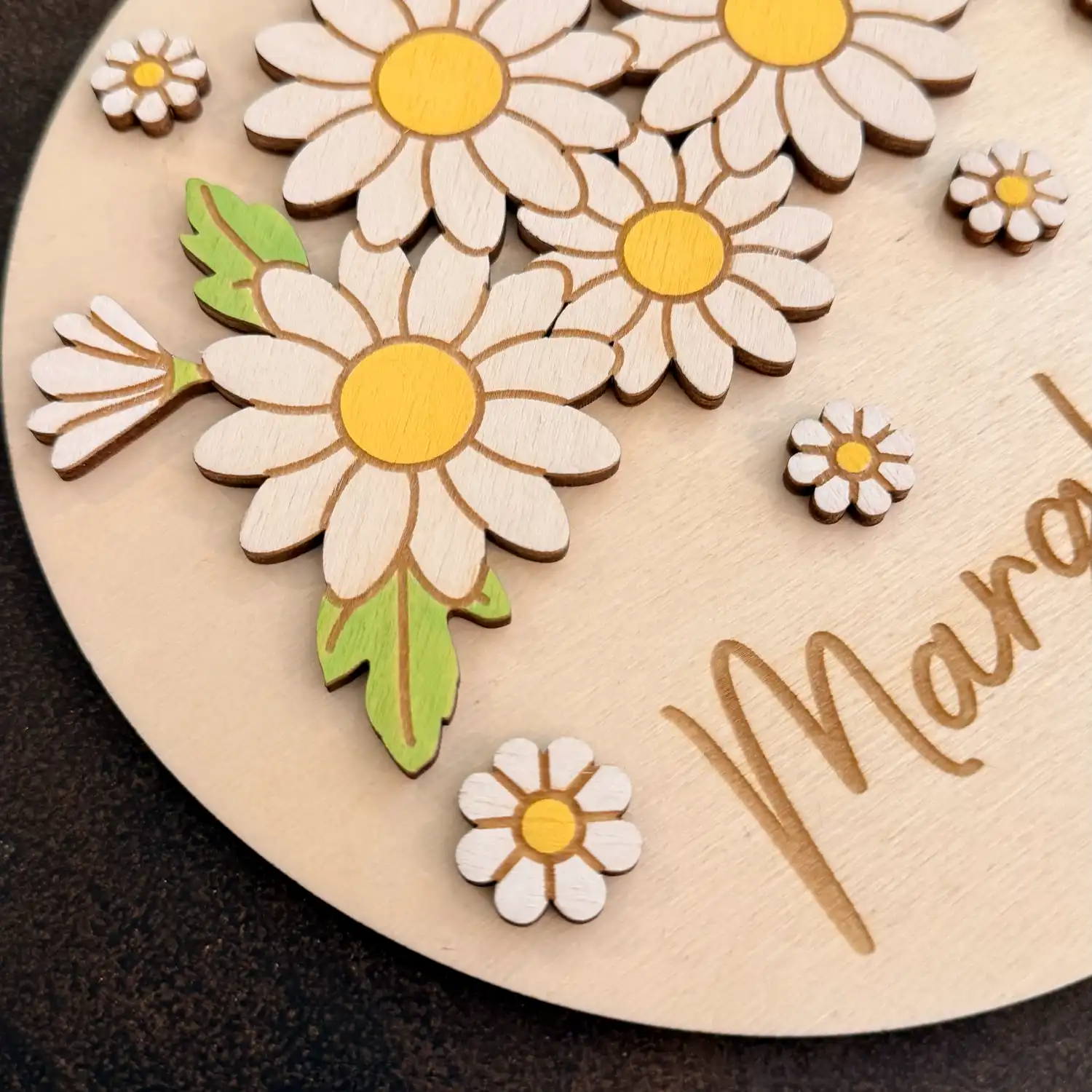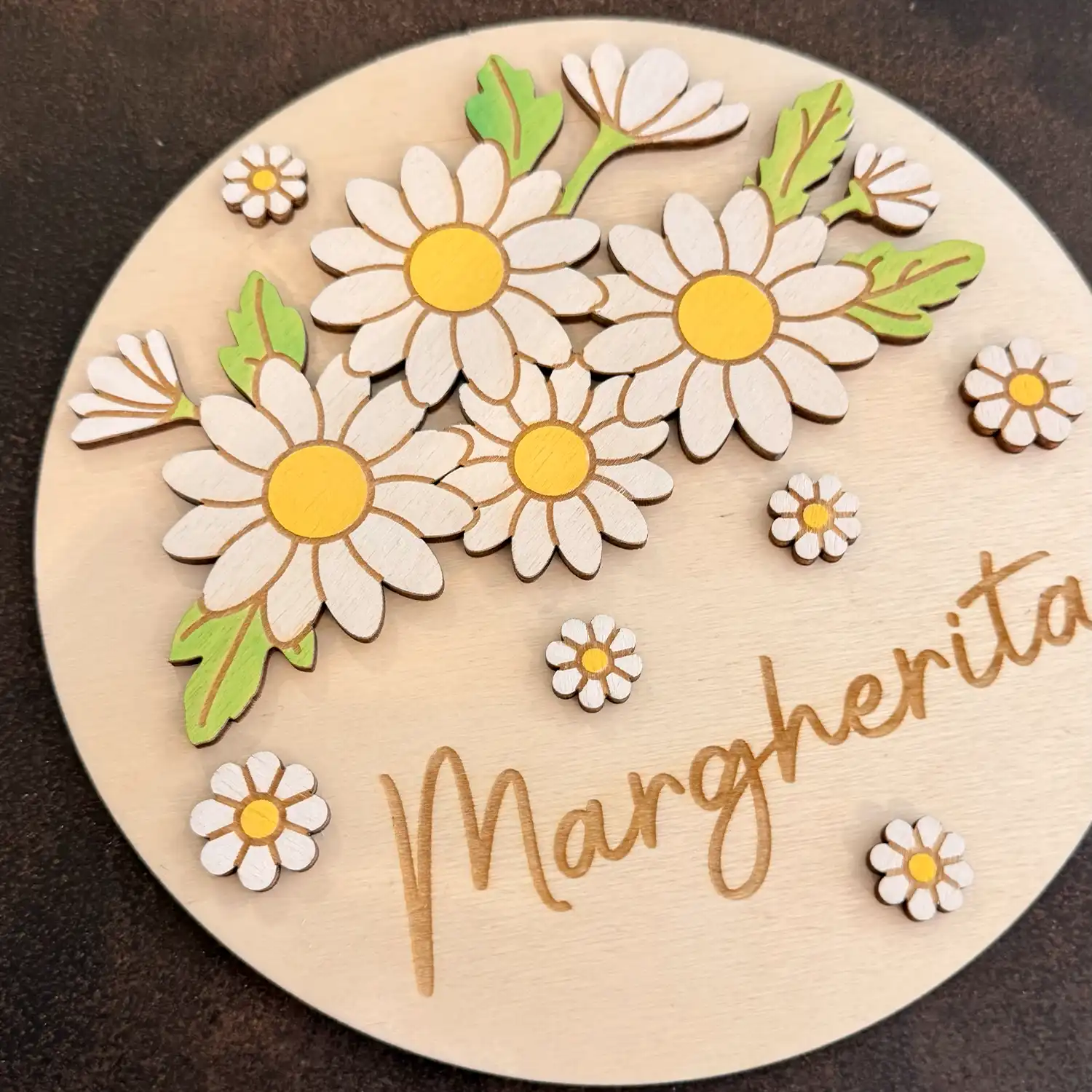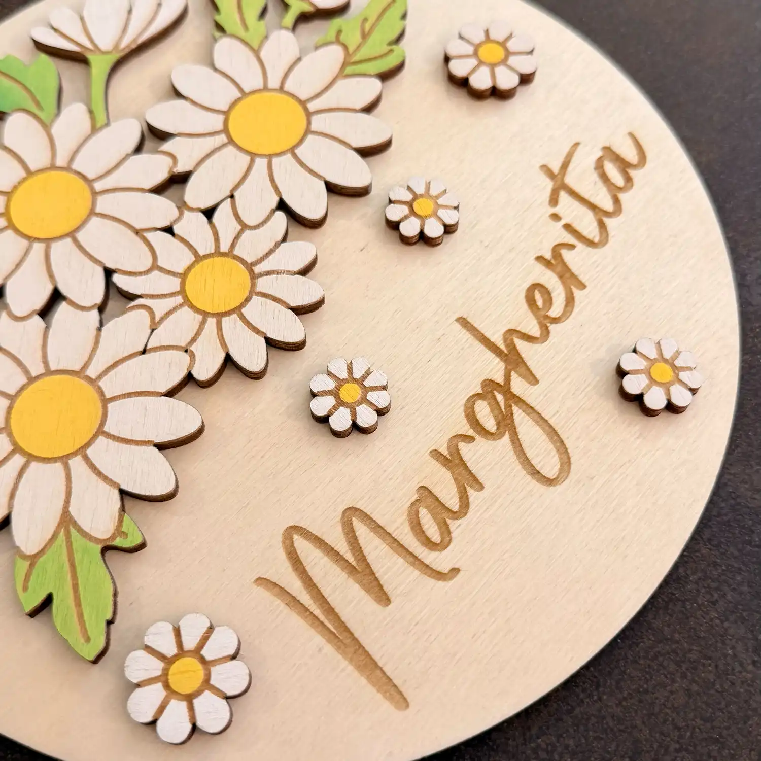 Insegna Margherite in Legno Personalizzata con Fiore e Nome Dipinta a Mano